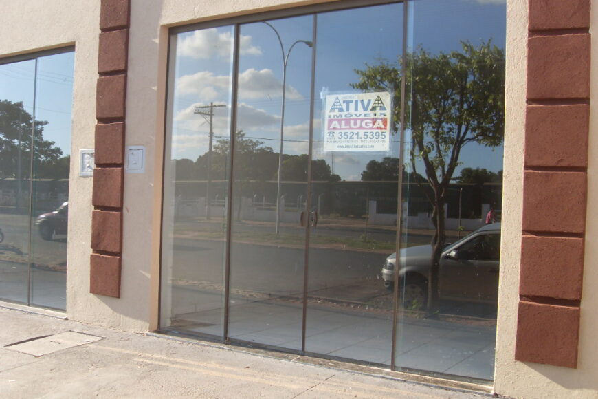 01 salao, copa, banheiro social, teto de laje com acabamento gesso, piso cerâmica, porta blindex, murado, no asfalto.